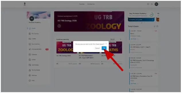 In the confirmation popup, click “OK” to join the live class.