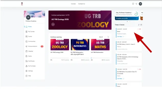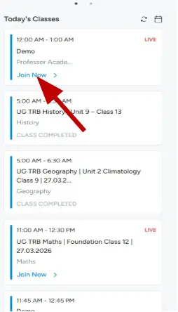 In the “Today’s Classes” section, select your live class and click the “Join Now” button.